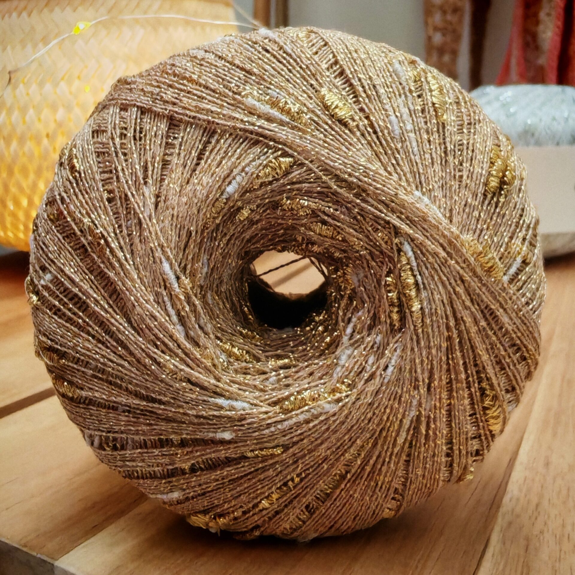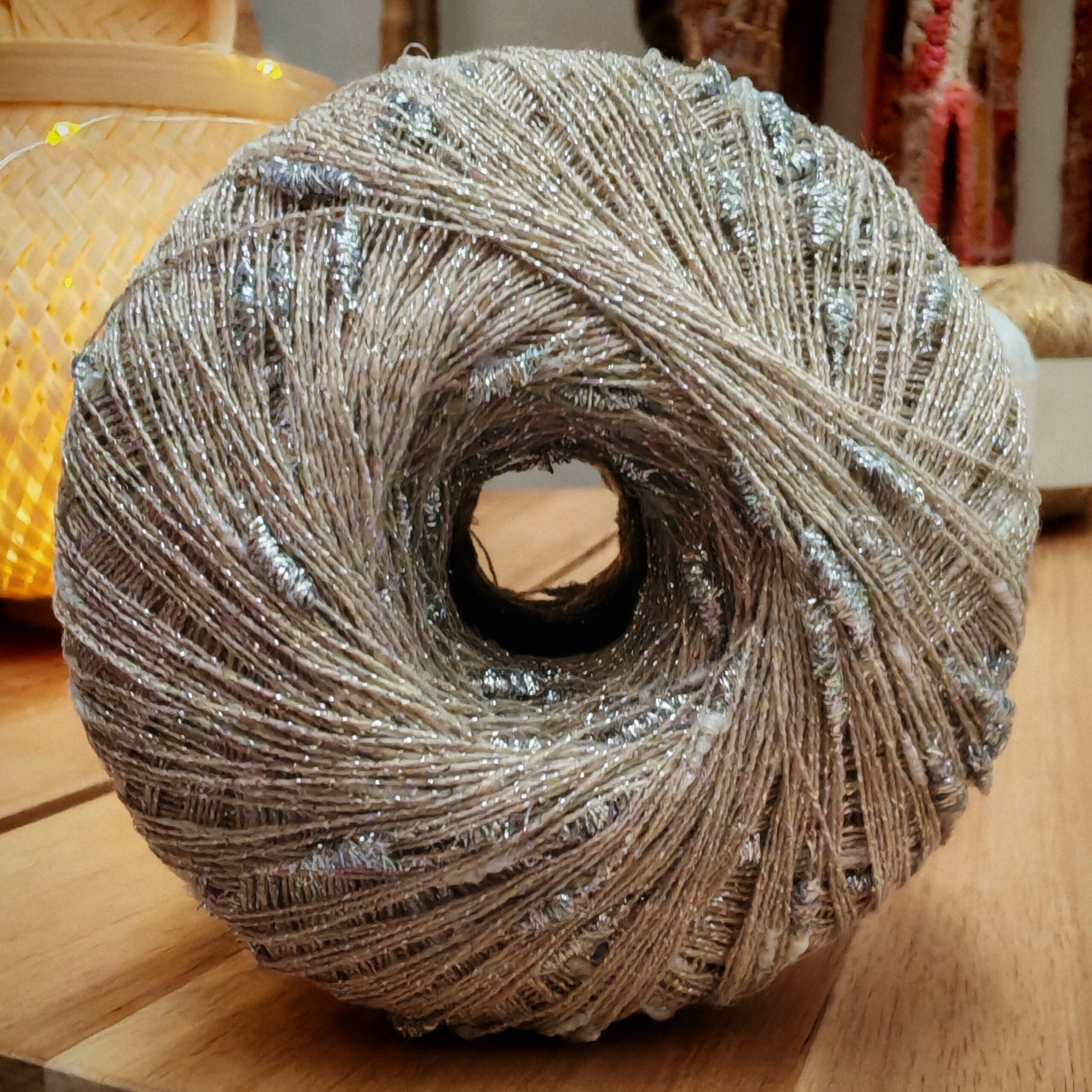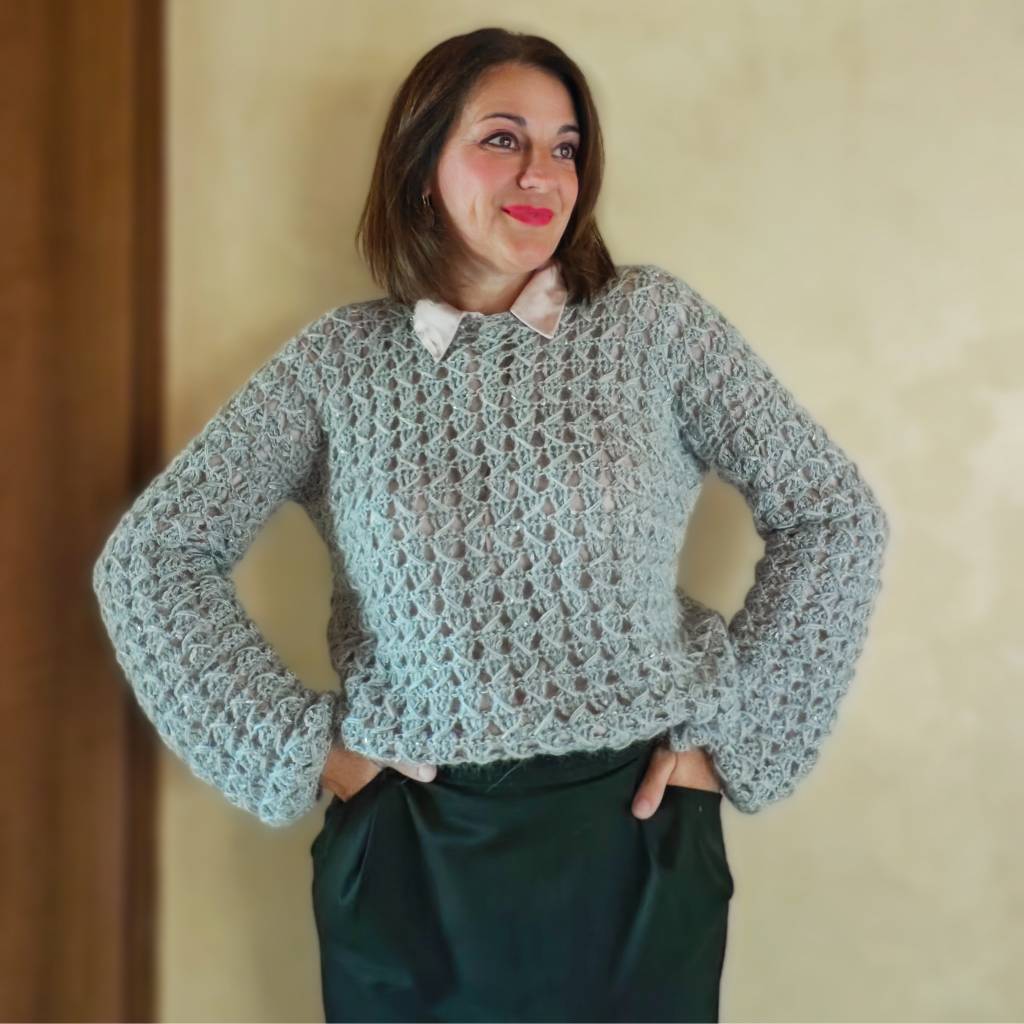 La caída es relajada y el brillo discreto de los hilos Glow añade una nota sofisticada sin perder la esencia handmade.