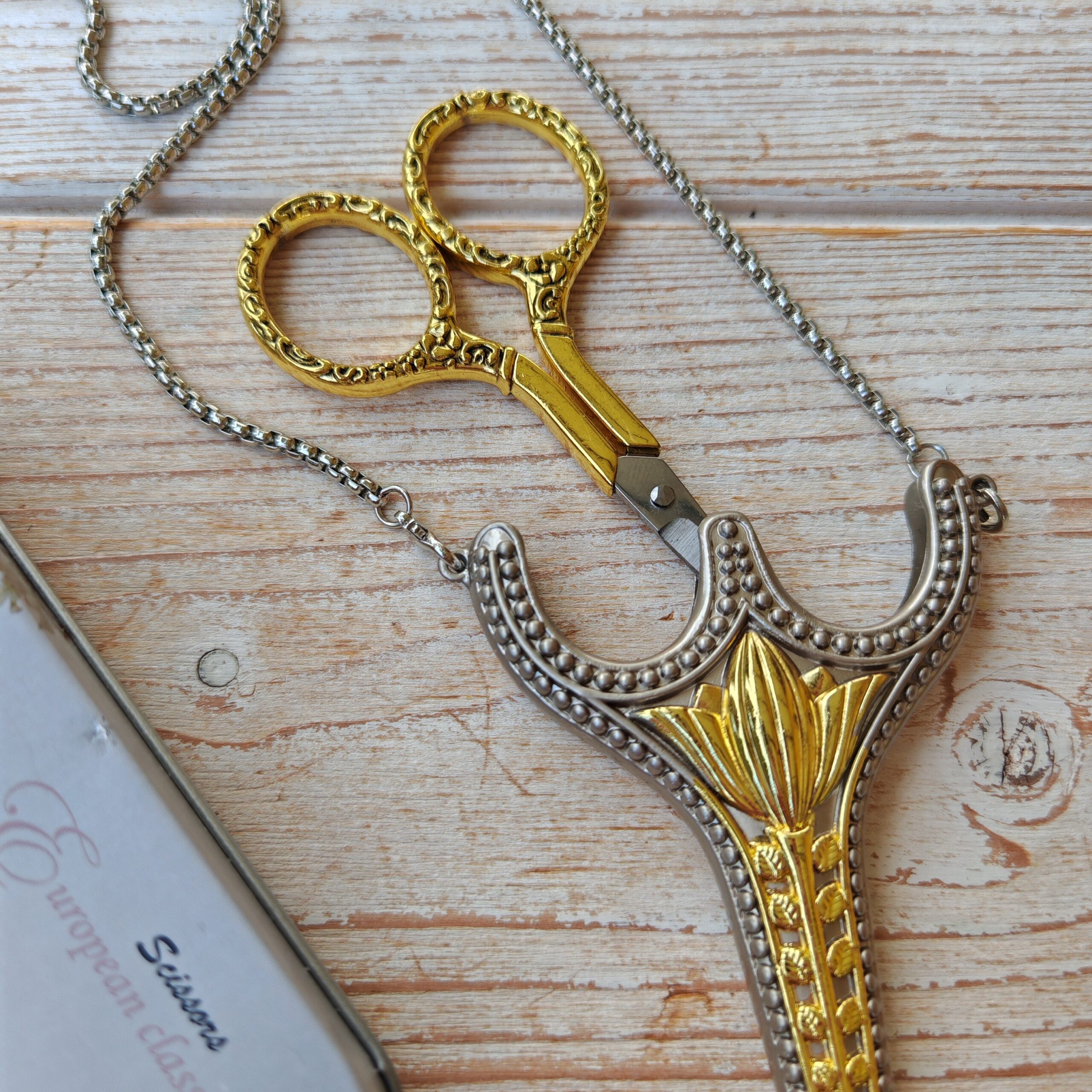 Elegancia y funcionalidad en un diseño único. Estas tijeras vintage son perfectas para amantes de la costura, el crochet o simplemente para quienes aprecian los detalles refinados. Su diseño artesanal combina un delicado estilo retro con una funda plateada a juego, que además de protegerlas, incluye un práctico collar para llevarlas siempre contigo.